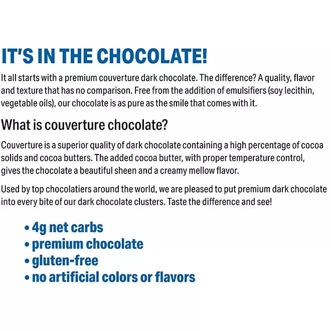 KETO Clusters Dark Chocolate 16oz offer a delicious, low-carb snack option crafted for ketogenic lifestyles. Each cluster combines rich dark chocolate with carefully selected ingredients to support your dietary goals without compromising on taste. Perfect for satisfying sweet cravings while maintaining ketosis, this 16oz pack provides convenient, portion-controlled servings ideal for on-the-go energy and indulgence.